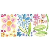 With its lush colors and playful feel, the Big Flowers mural set from Wallies turns a bedroom or lounging area into a blooming world. Pre-pasted for simple application, the vinyl-coated wallpaper pieces require just a wash of water to activate their stickiness and then can adhere to almost any smooth surface. Designed for versatile arrangement, the set features large blooms to center a grouping as well as small ones for creating borders or dotting a room with accents. Throughout the set, the stylized shapes and complementary colors provide harmony and variety at once. The biggest flower, an orange-centered pink blossom, measures 29 by 60 inches, while its smaller blue cousin comes in at 24 by 40 inches. An array of 24 small blossoms and 11 dots rounds out the set. Washable with a damp cloth, the mural is acid- and lignin-free and strippable when it comes time to re-decorate.Want to learn more information about Wallies Wallpaper Big Flowers Mural, Set of 3 Sheets?